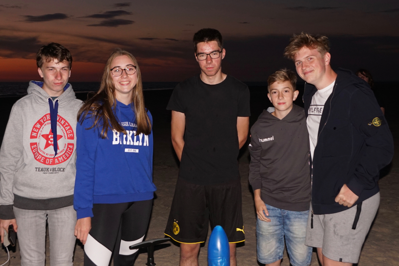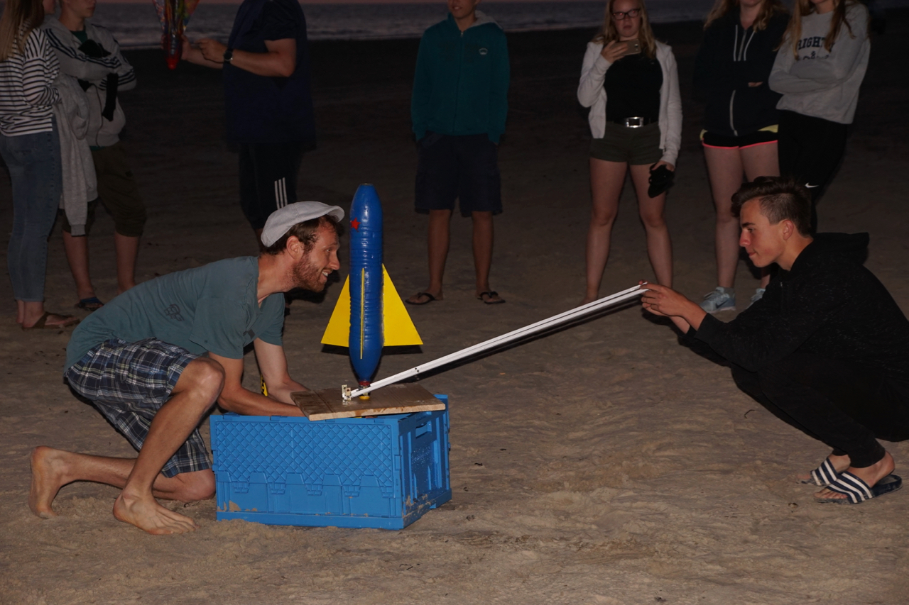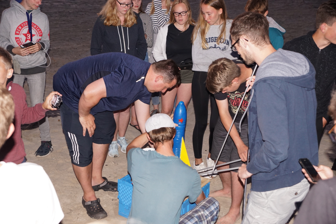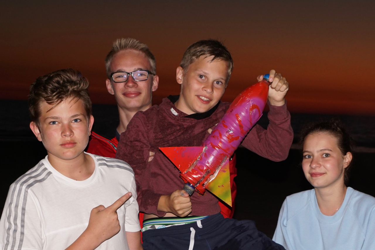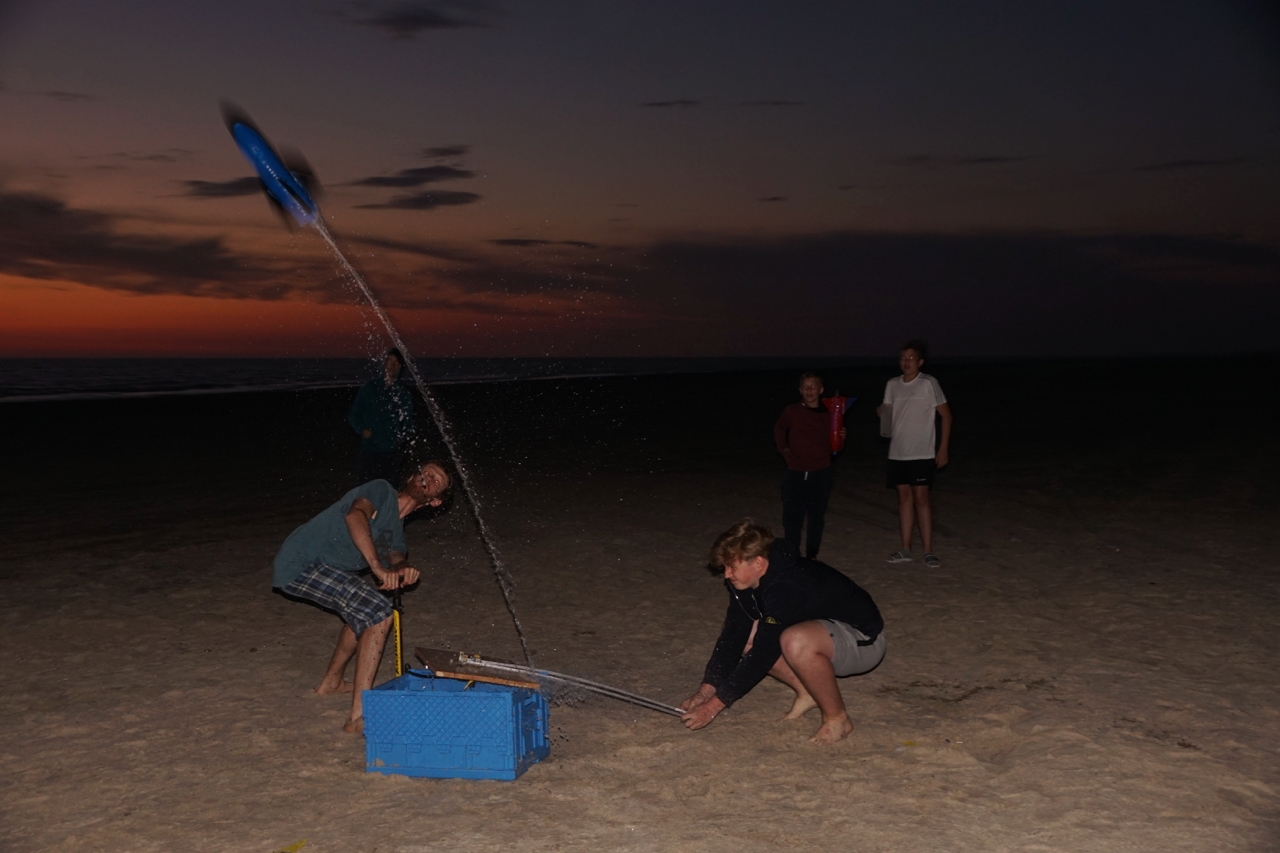 Als dann noch alle Raketen mit einem Namen versehen waren ging es am Abend auch sofort zum Strand: Alle waren aufgeregt! Würde ihre Rakete fliegen? Vor dem Start wurden die Raketen befüllt und es ging los. Viele Raketen flogen bis zu ca. 10 Meter in die Höhe, andere hingegen 10 Meter in Richtung Meer. Einige verloren ihr Flügel, flogen aber lange, andere blieben stabil bis sie dann am Boden zerschellten.
