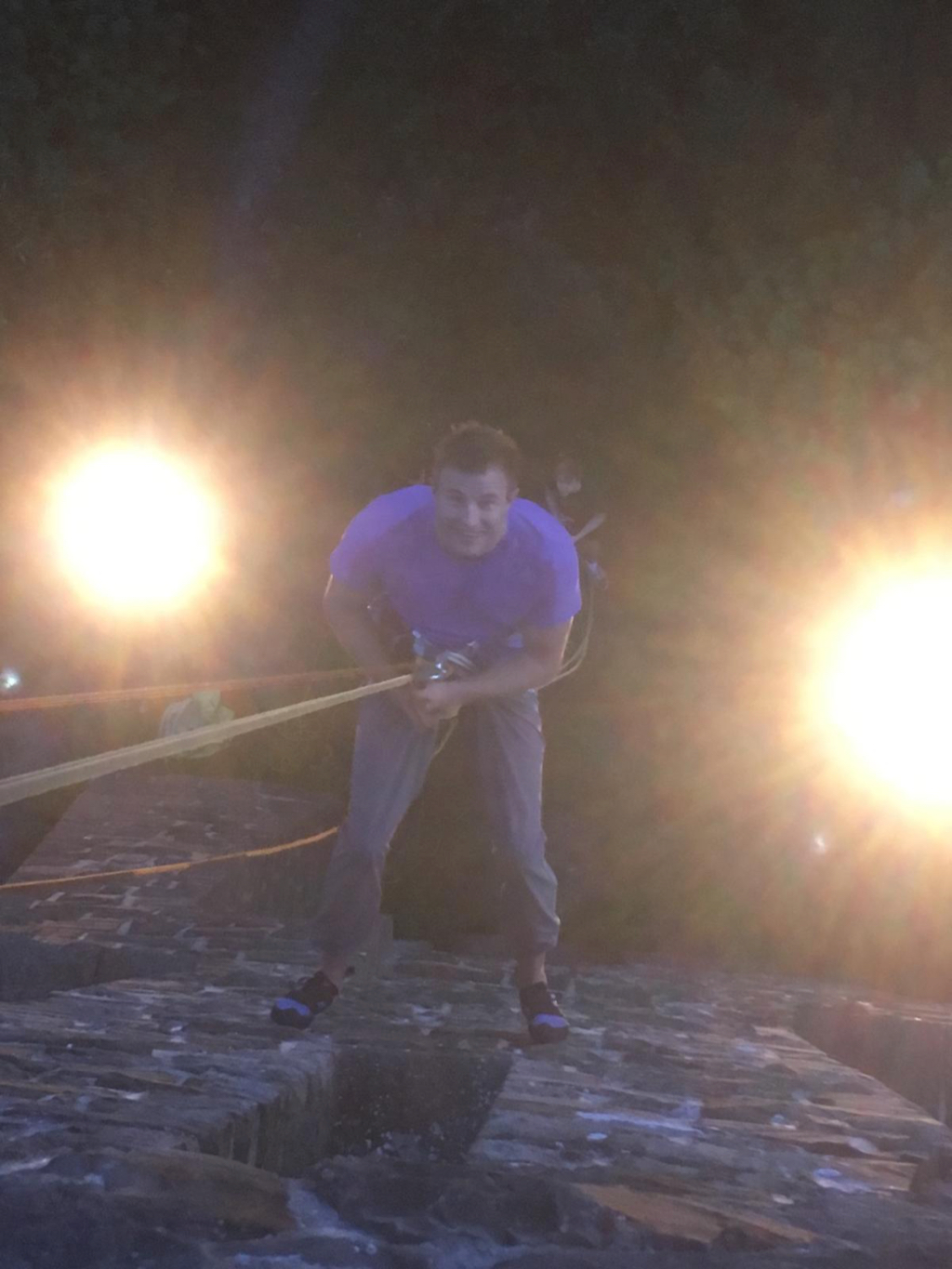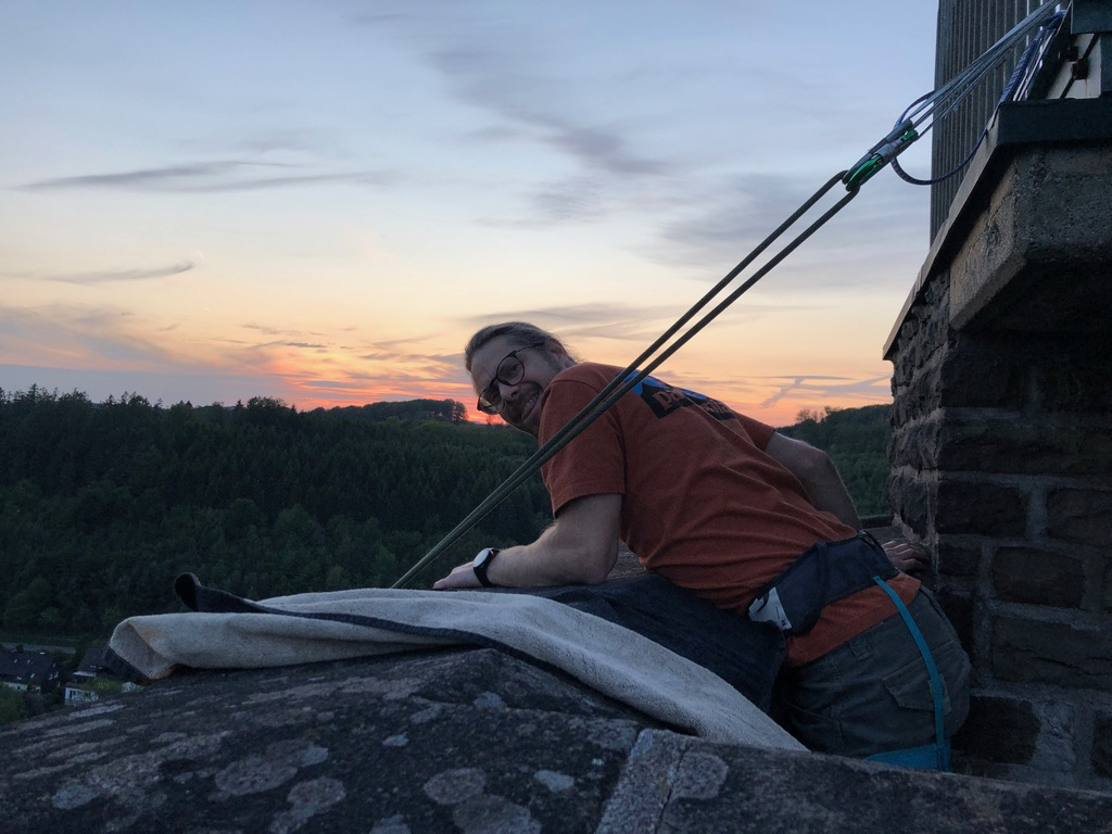 Dort werden wir uns dann, von einem professionellen Kletter-Trainer begleitet, aus 18 Meter Höhe abseilen. Ihr benötigt dafür nur ein wenig Mut und Vertrauen. Klettererfahrung oder Material wird nicht benötigt. Sportschuhe mit Profil und ein Haargummi bei langen Haaren wäre jedoch sinnvoll. Ein Klettergurt sowie ein mehrfach geprüftes und 3-fach gesichertes Sicherungssystem werden zur Verfügung gestellt.
