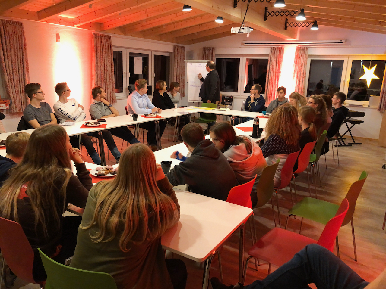 Am ersten Adventswochenende fand die traditionelle Mitarbeiterfreizeit des CVJM Ründeroth statt. Sie richtet sich an Mitarbeiter und an Interessierte, die gerne im Bereich der Kinder-, Jugend-, Konfirmanden- oder Projektarbeit aktiv werden wollen. Das Wochenende dient dazu, große Themen des Folgejahres zu besprechen, Schulungseinheiten anzubieten und sich mit der eigenen Geschichte zu befassen. Über ein Wochenende erstrecken sich somit einige thematische Blöcke, die vorher von unserem Jugendreferenten Harald Hüster und anderen Mitarbeitern vorbereitet wurden.